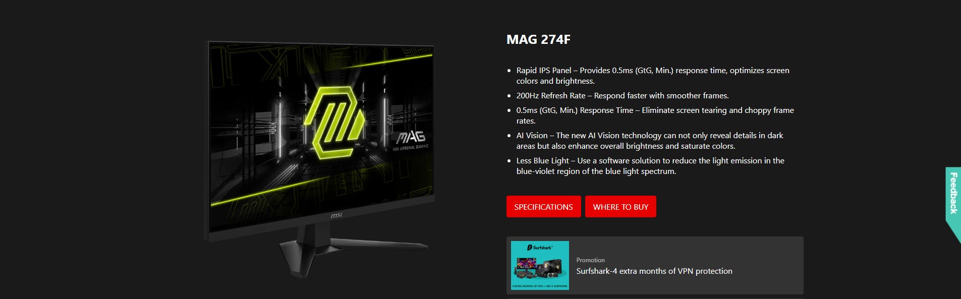 MSI MAG 274F 27”/ Rapid IPS / 200Hz / 0.5ms / HDR / FHD / AI-V