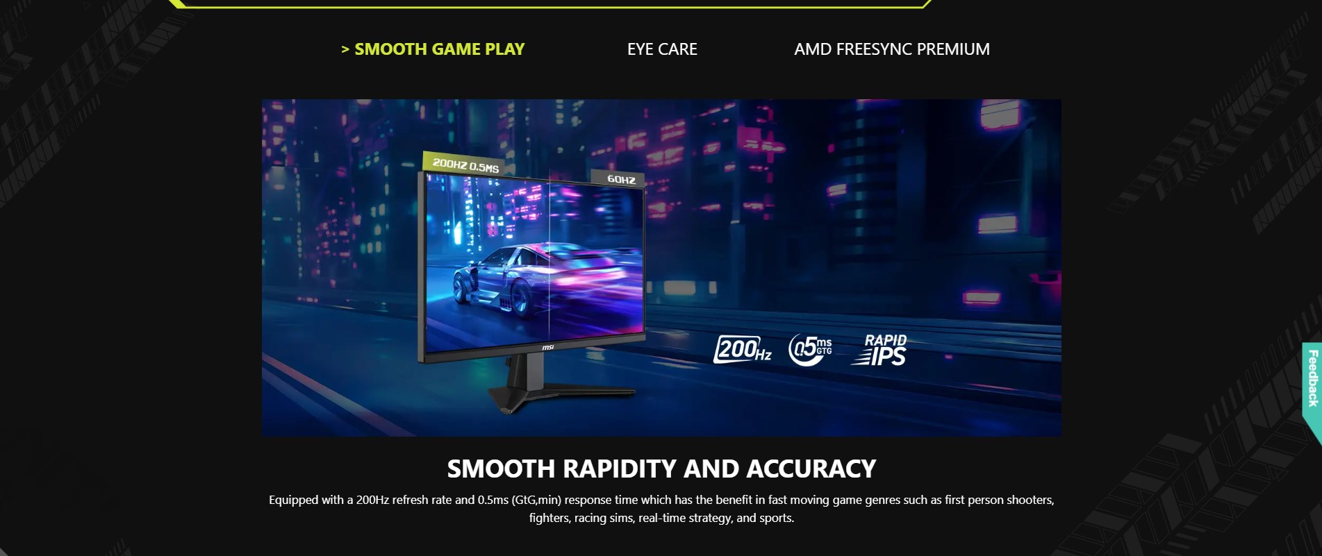 - Rapid IPS Panel – Provides 0.5ms (GtG, Min.) response time, optimizes screen colors and brightness.