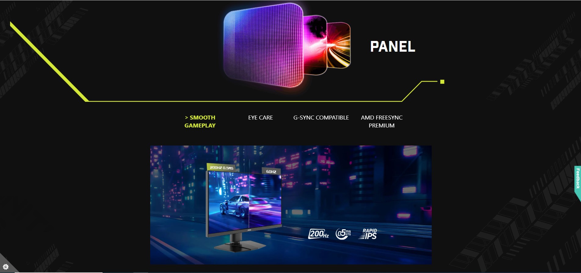 Rapid IPS Panel – Provides 0.5ms (GtG, Min.) response time, optimizes screen colors and brightness.